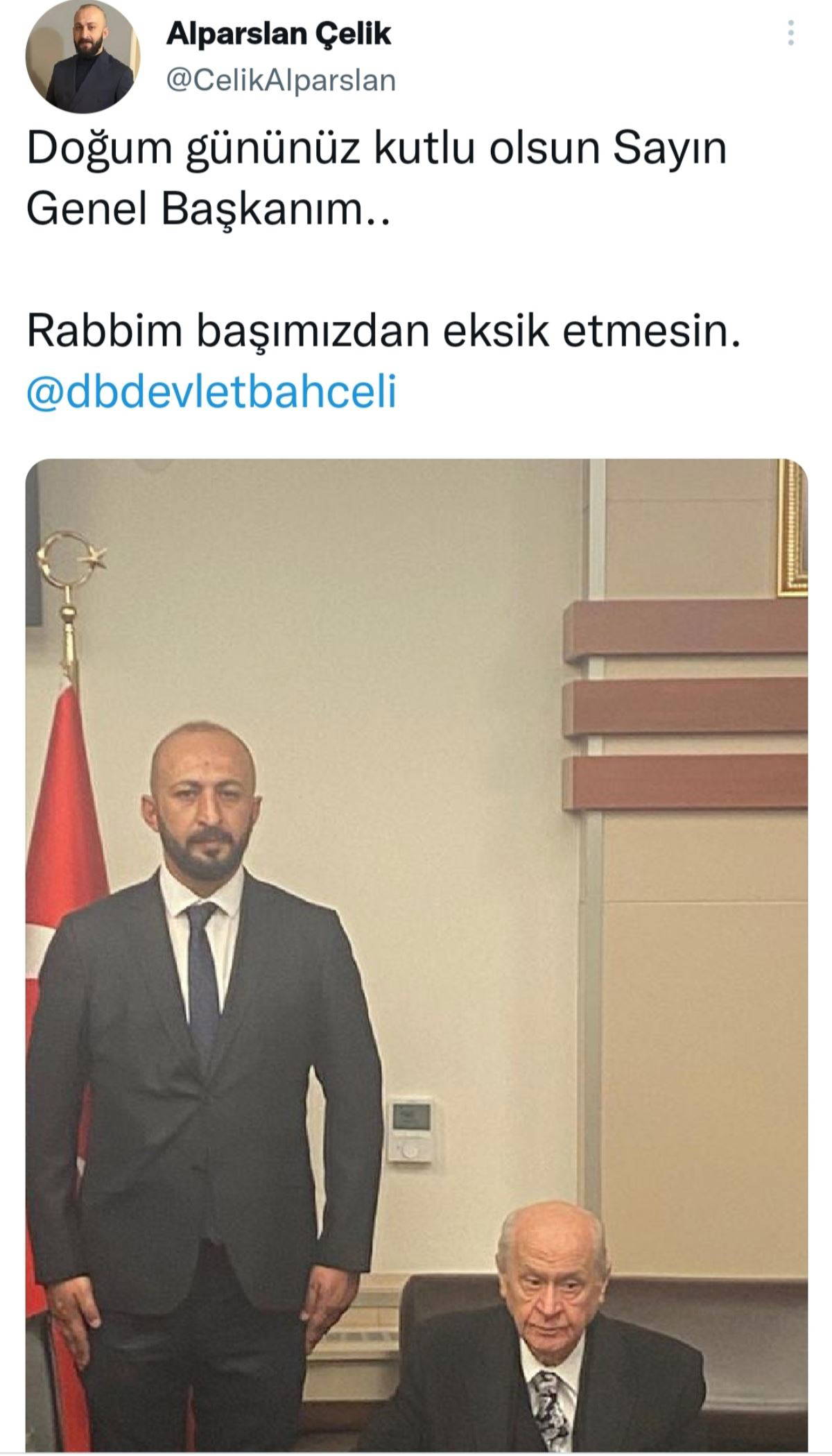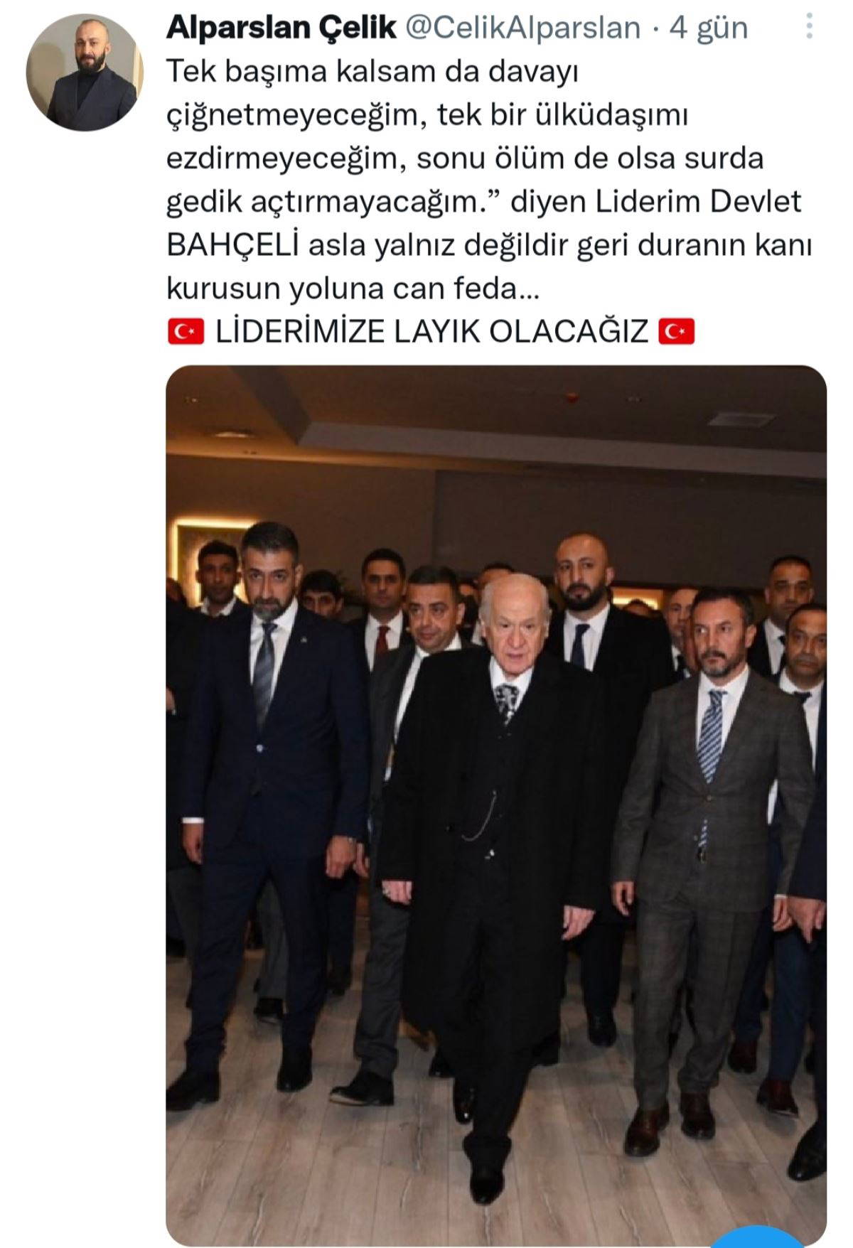 Gerçekten de Alparslan Çelik, bu yazı yazıldığı sırada, MHP Genel Merkezi’nden, Bahçeli’nin en yakınından fotoğraf paylaşmaya devam ediyor. Sinan Ateş cinayeti sonrası attığı mesajlara bakılırsa, en çok da Semih Yalçın ve İzzet Ulvi Yönter’le anlaşıyor gibi görünüyor! Bahçeli’nin “Tek bir ülküdaşımı ezdirmeyeceğim” sözünü duyan savcılar ise ellerindeki dosyaları faili meçhule sevk etmeye devam ediyor!