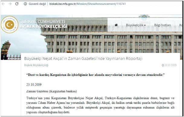 Yukarıdaki FETÖ övgüleri Türkiye’nin Bişkek Büyükelçiliği’nin resmi sayfasında halen duruyor.