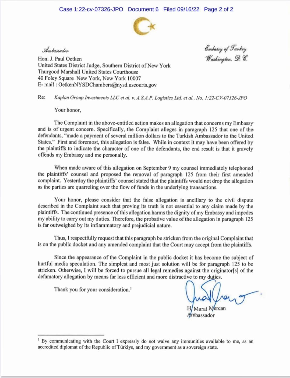 Gerçekten de dosyaya, 16 Eylül 2022 tarihinde, Türkiye Büyükelçiliği antetli bir evrak girmiş. Evrakta Mercan’ın imzası var. “Her şeyden önce iddialar gerçekdışı” diyen Mercan, yazdıklarımı işaret ederek “Şikâyetin kamuya açıklanmasının ardından, olay medya spekülasyonlarının konusu haline geldi” diyerek rahatsızlığını belirtiyordu. Diplomatik dokunulmazlığını hatırlatan Mercan, bu nedenle dava kapsamında yargılanamayacağını, ABD mahkemelerinin kendisi üzerinde bir yargı yetkisi olmadığını ifade ediyordu. Talebini ise şöyle aktarıyordu: “Bu fıkranın (suçlamanın yapıldığı 125. madde) kamuya açık olan orijinal şikâyetten ve mahkemenin davacılardan kabul edebileceği değiştirilmiş herhangi bir şikâyetten çıkarılmasını saygılarımla arz ederim.”