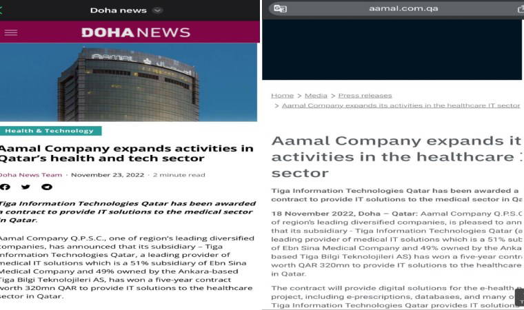 Bu aşamadan sonra acaba Arap medyasında bir şey çıkmış mı diye baktım. 18 Kasım 2022’deki haber, Katar ile Tiga arasında, sağlık alanında bilişim teknolojileri için, 5 yıllığına 320 milyon Katar Riyali (88 milyon dolar) değerinde bir anlaşma yapıldığını haber veriyor.
