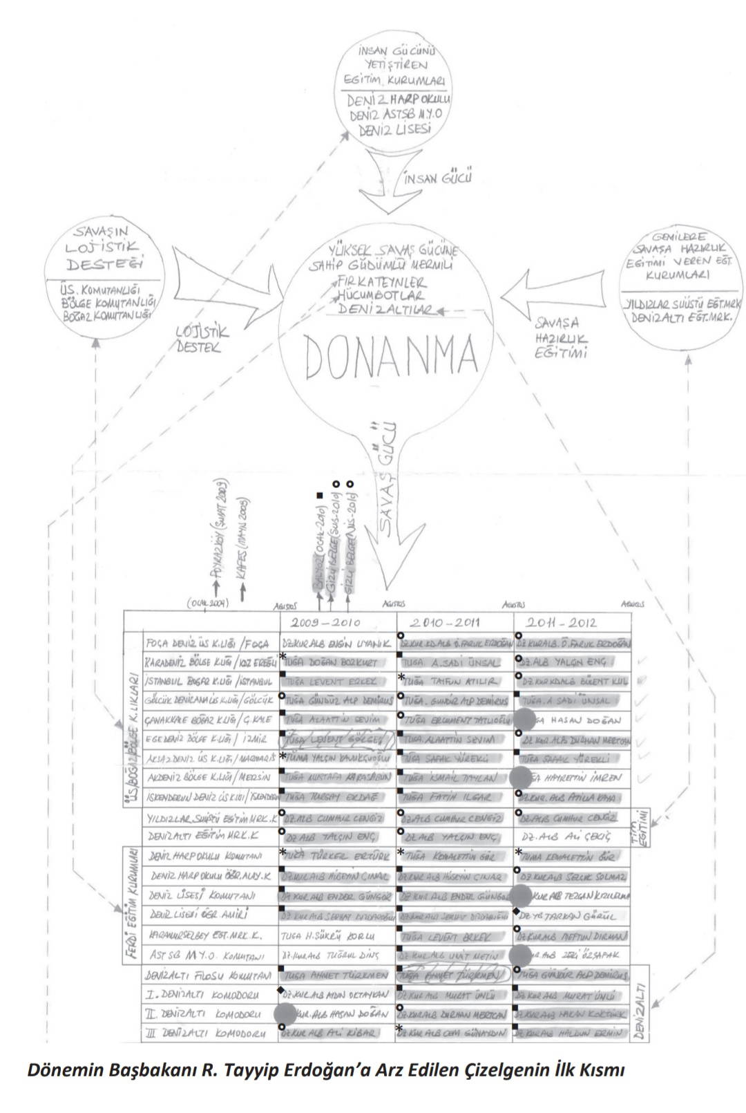 “Olayların zirve yaptığı 2009-2012 yılları arasında Deniz Kuvvetleri’ndeki kadro ve atamaları mercek altına alıp kritik görevlerde bulunan ve kumpasa uğrayan personel ile ilgili bir çalışma yapmıştım.(…) Başbakan, ‘Yan tarafa geçelim’ dedi. Geçtik ve yaptığım çalışmayı masanın üzerine serdim.”