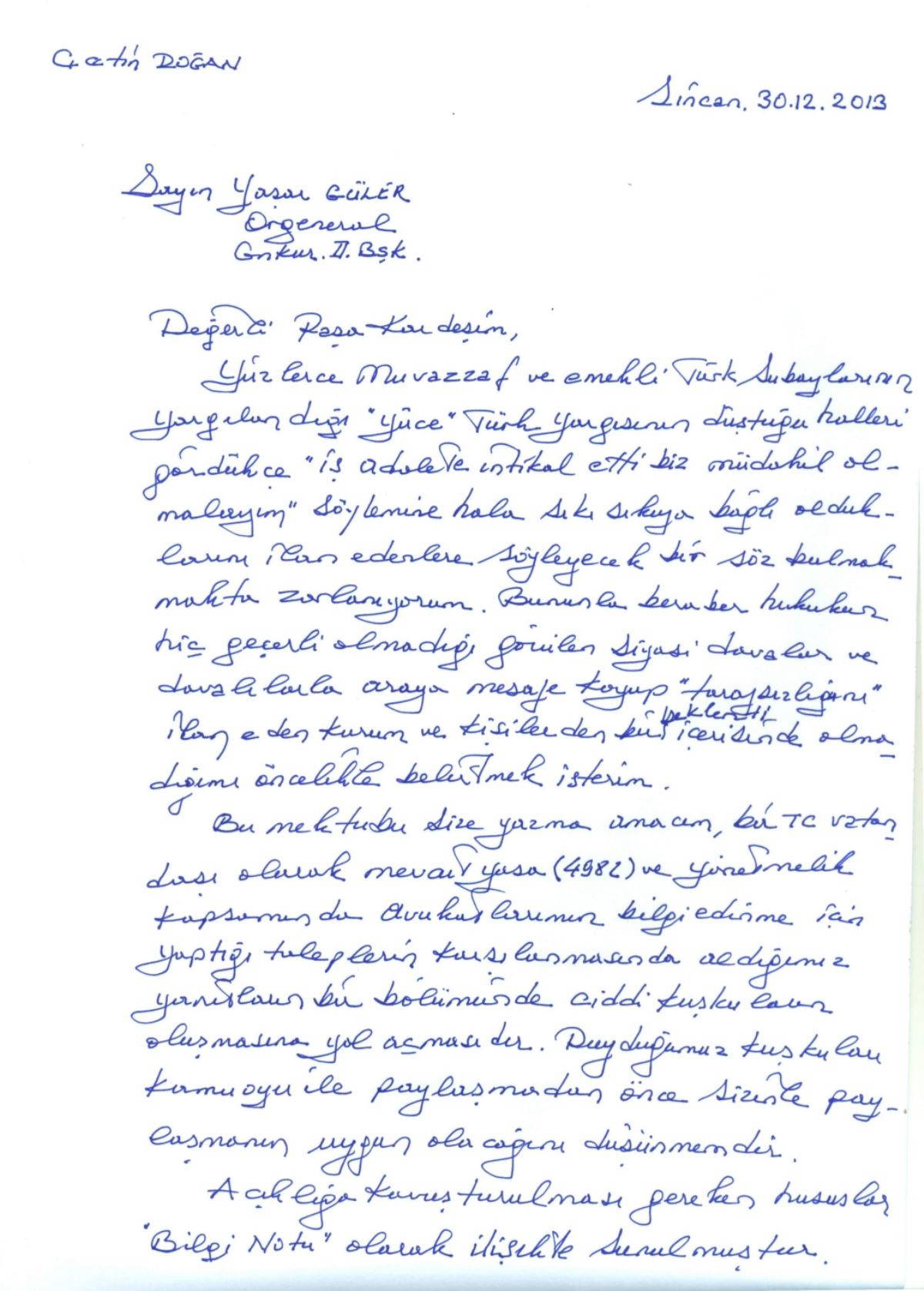 Çetin Doğan, emekli bir orgeneral değil, sıradan bir vatandaş olarak yazdığını söylediği mektupta, Yaşar Güler’e, Genelkurmay Adli Müşavirliği’nin kuşkulu durumunu aktarmış. Meselenin hassasiyeti nedeniyle, kuruma değil, "kişiye özel" mektup yazdığını söyleyen Doğan’ın satırlarının sonunda şöyle bir not var: