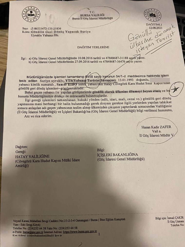 Suriye uyruklu YTS (Yabancı Terörist Savaşçısı) 13.01.1993 doğumlu Samer Elbo isimli yabancının Hatay Cilvegözü Kara Hudut Sınır Kapısı’ndan gönüllü geri dönüş işlemleri planlanmaktadır. Bahsi geçen yabancı ile yapılan görüşmelerde gönüllü olarak ülkesine dönmeyi beyan etmiş ve bu hususta müdürlüğümüze dilekçe ile müracaatta bulunmuşlardır.”
