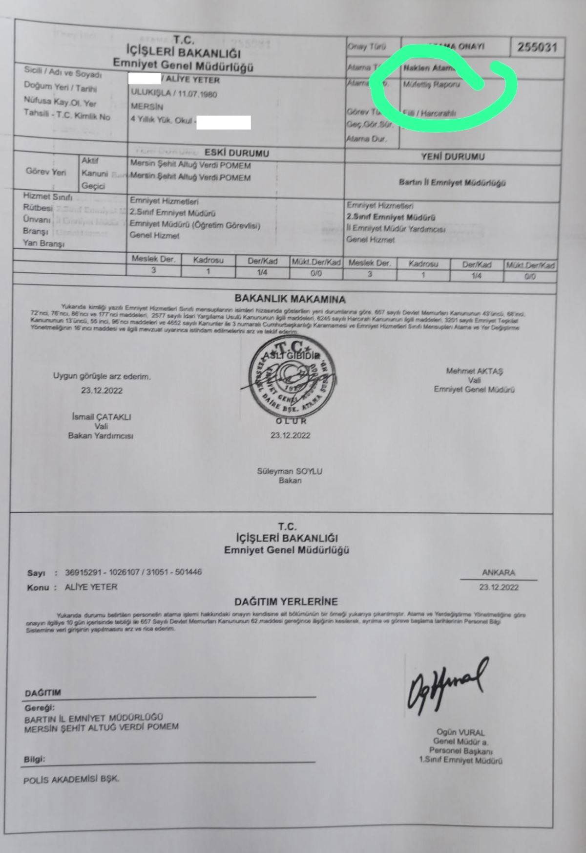 Sonuncusu Aliye Yeter. Yine 23 Aralık’ta, Mersin’den alınıp Bartın’da görevlendirilmiş. İsim benzerliği değil...