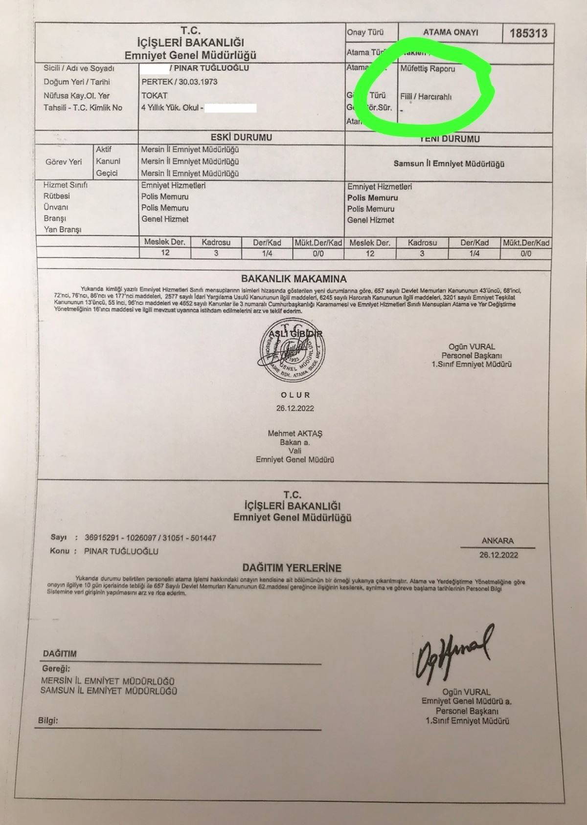 Tayin edilen üç kişiden biri Pınar Tuğluoğlu. Mersin İl Emniyet Müdürlüğü’nden 26 Aralık’ta Samsun’a gönderilmiş.