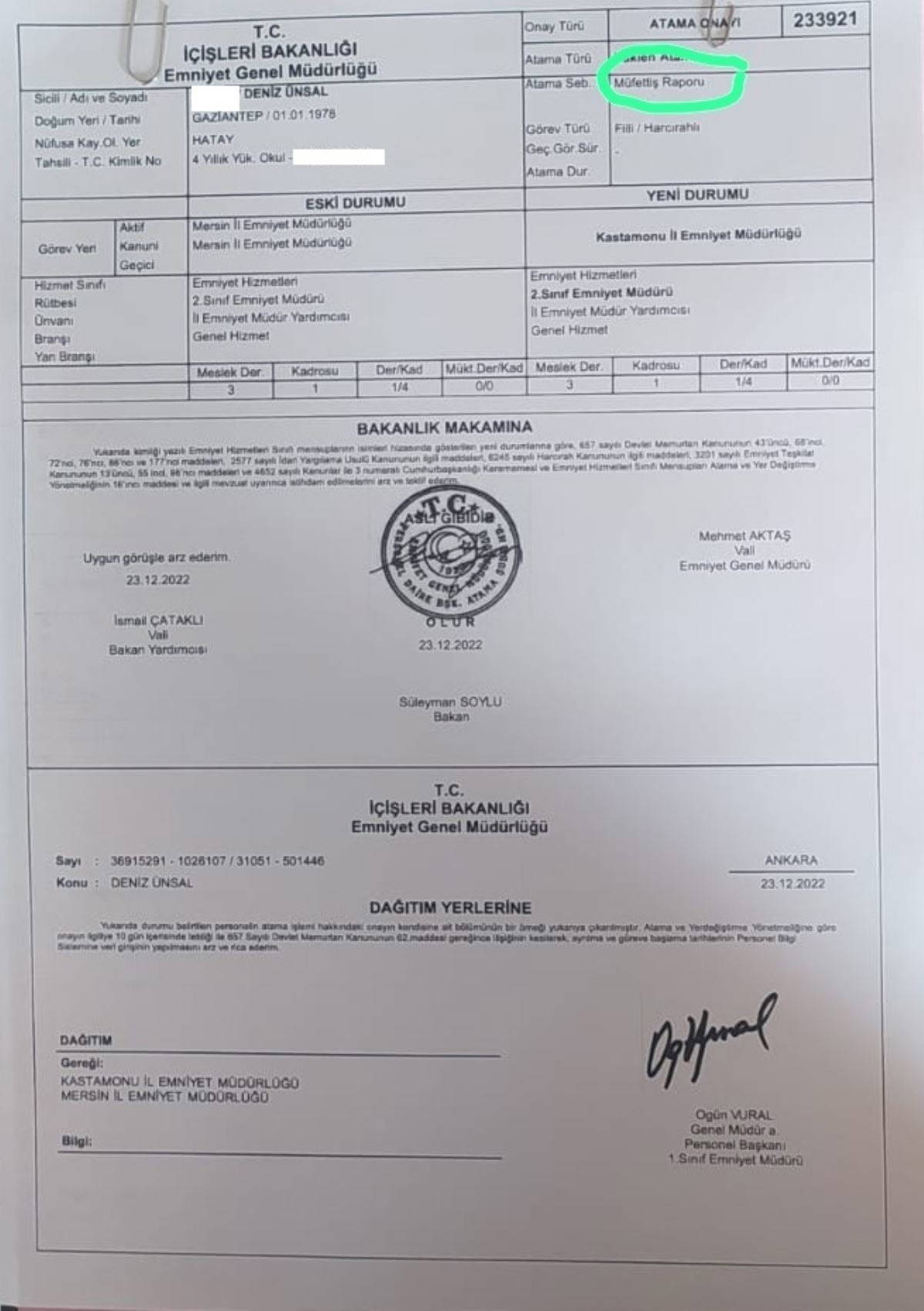 Diğeri Deniz Ünsal. 23 Aralık’ta Mersin’den Kastamonu’ya tayin edilmiş.
