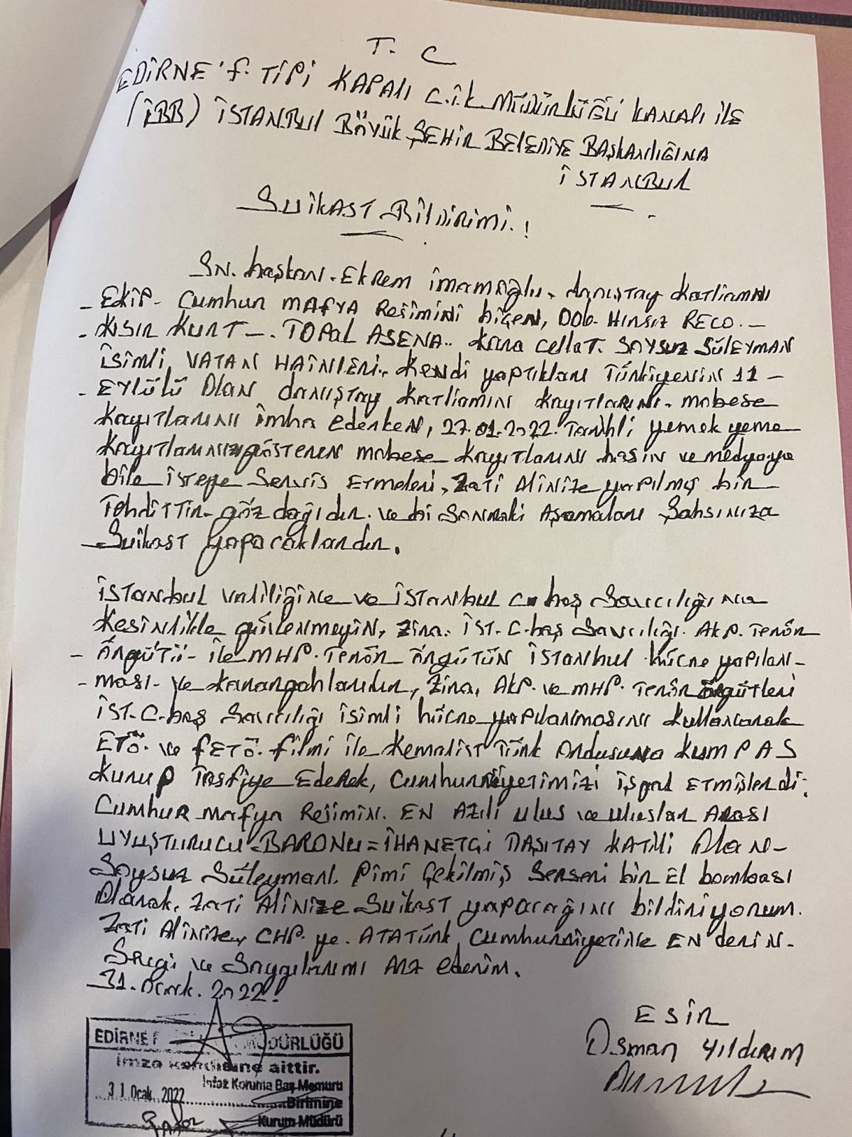 Altındaki tarihten anlaşılıyor. 31 Ocak 2022 günü koğuş kapısı açılıp cezaevi idaresine teslim edilmiş. Dilekçe, “Suikast Bildirimi!” başlığını taşıyor. Osman Yıldırım, önümüzdeki günlerde İmamoğlu’na bir suikast yapılacağını iddia ediyor.