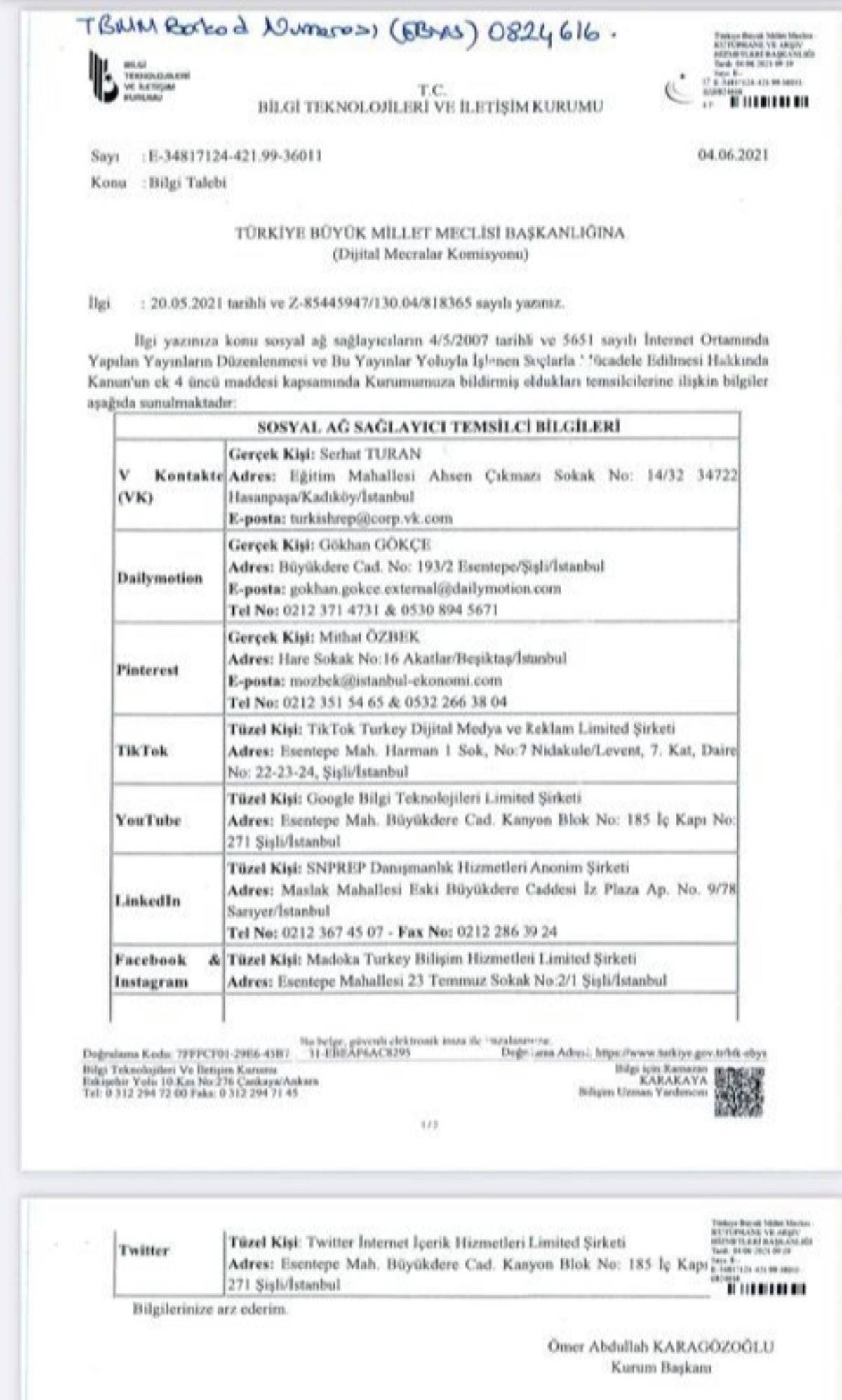 Hani “sosyal medya şirketleri gereğini yapmıyor” deniyor ya. Meclis’teki Dijital Mecralar Komisyonu, geçen aylarda, Bilgi Teknolojileri İletişim Kurumu Başkanlığı’na (BTK) “Temsilcileri var mı, varsa kim” diye sormuş. BTK ise yanıt vermiş. Artık hepsinin Türkiye’de temsilcilikleri görünüyor. YouTube, Facebook, Twitter, Instagram, Tiktok; Şişli’de birer şirket kurmuş. LinkedIn’in şirketi Sarıyer’de. Dailymotion Gökhan Gökçe’yi, Pinterest Mithat Özbek’i, V Kontakte Serhat Turan’ı temsilci atamış. Kısacası hepsinin artık memleketimizde bir adresi, bir telefonu var.