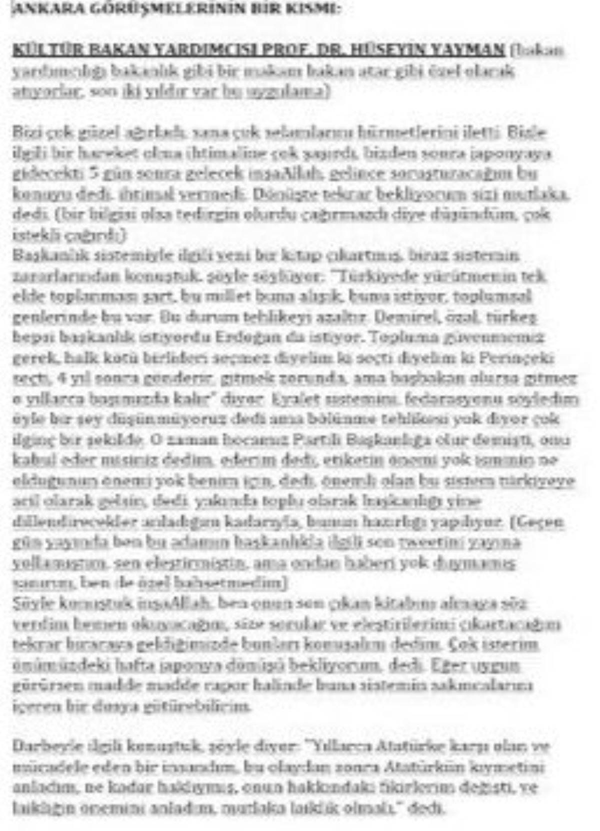 Görüşme notlarında, Yayman’ın Oktarcılara, o dönem henüz geçmediğimiz Başkanlık Sistemi’ni, AKP’nin getirmeye hazırlandığını anlattığı görülüyor. Atmaca, çıkan sonucu “yakında toplu olarak başkanlığı dillendirecekler anladığım kadarıyla, bunun hazırlığı yapılıyor” diyerek Oktar’a not etmiş.