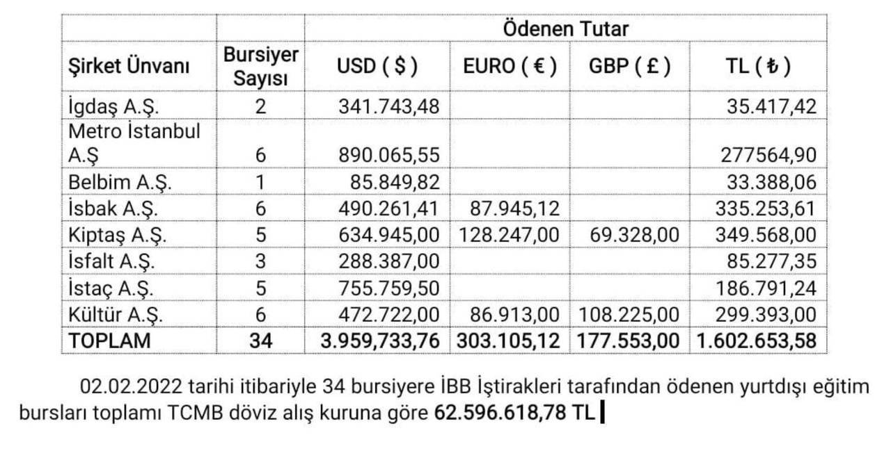 Müfettişler, İBB şirketleri sponsorluğunda yurtdışı eğitimine gönderilen 38 kişi için inceleme yapmışlar. Bunlardan ikisinin İGDAŞ, altısının KÜLTÜR AŞ, üçünün İSFALT AŞ, altısının İSBAK AŞ, beşinin ULAŞIM AŞ, beşinin İDO AŞ, beşinin İSTAÇ AŞ, beşinin KİPTAŞ ve birinin de BELBİM AŞ gelirleri ile gönderildikleri tespit edilmiş. İDO 2011’de özelleştirildiği için beş kişi hakkında inceleme yapılamamış. Kalanlar hakkında rapor hazırlanmış. Tablonun bütünü çıkmış.