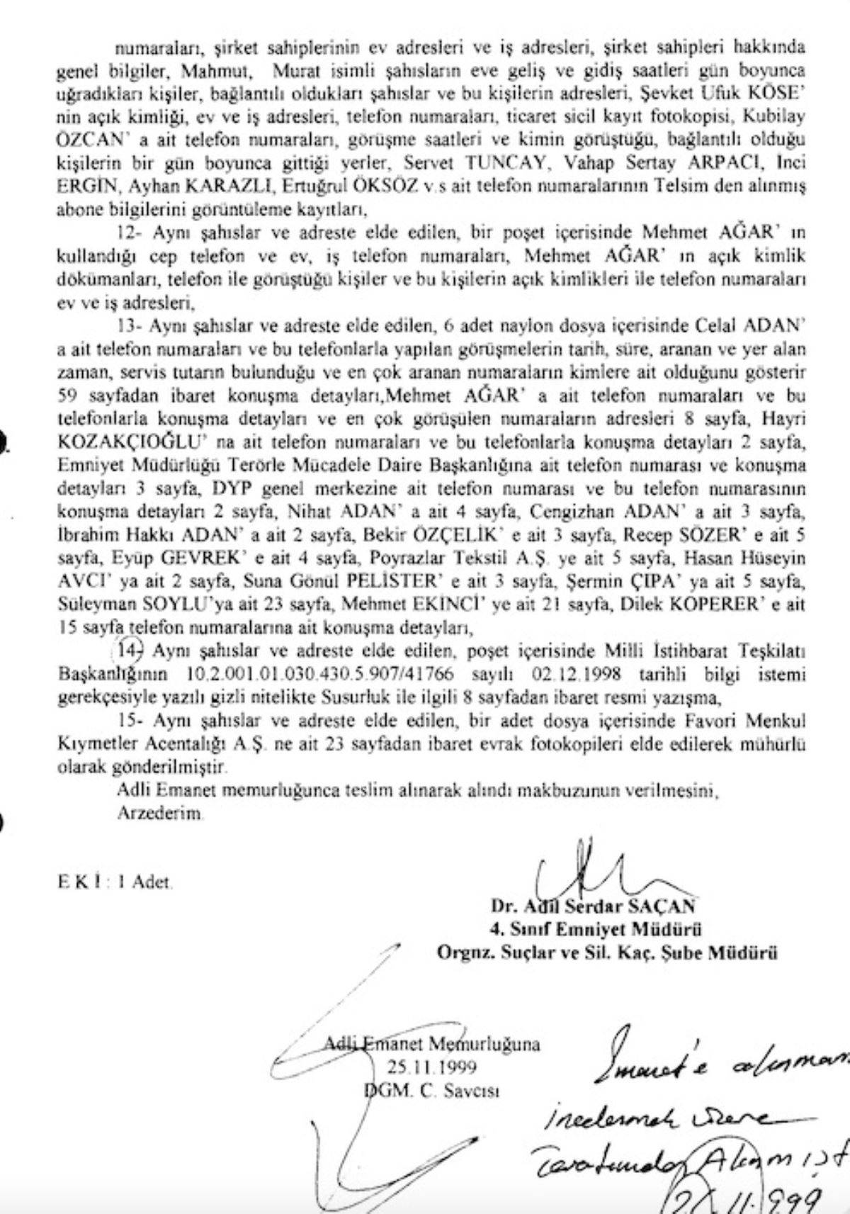 Eski Emniyet Müdürü Adil Serdar Saçan’ın imzaladığı; Mehmet Ağar, Celal Adan, Hayri Kozakçıoğlu gibi isimlerin dinleme kayıtlarının grupta yakalandığının anlatıldığı belgede şu yazıyor: “Süleyman Soylu’ya ait 23 sayfa konuşma detayları.”