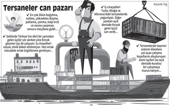 “Bu gemi bir kara tabut, badem gözlüm beni unut...” Evet belki Tuzla, Aliağa’ya da diğer tersaneler ve oralarda yapılan gemilerde atom bombasının izleri yok ama oralarda ölüm kol geziyor. Milyarlarca liralık gemilerin yapımında çalışan işçiler için birkaç bin liralık önlemler, “büyük bir maliyet” olarak görüldüğü için son sekiz yılda en az 226 işçi yaşamını yitirmiş durumda...