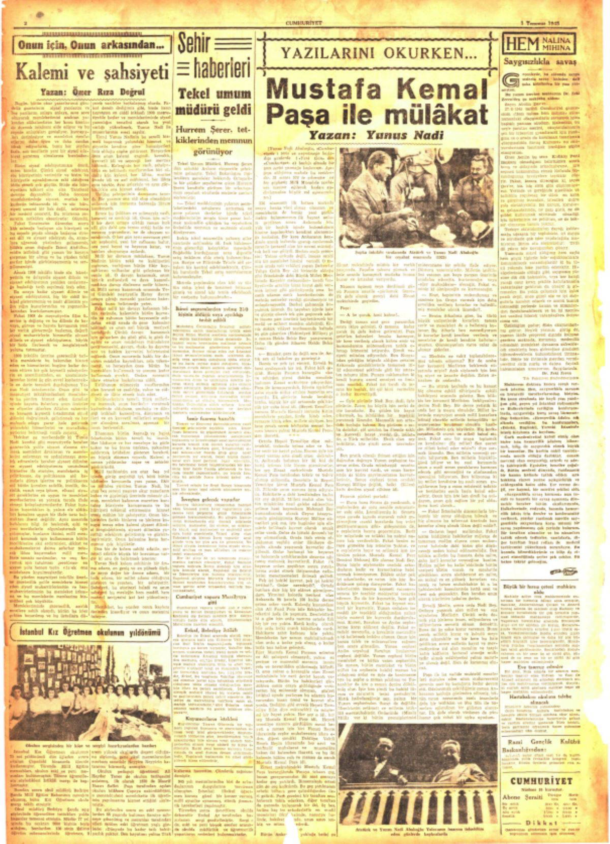(Cumhuriyet gazetesinde Yunus Nadi'nin 1924 yılında Atatürk'le yaptığı röportaj 1945'te Türkçeleştirilerek yeniden yayımlandı.)