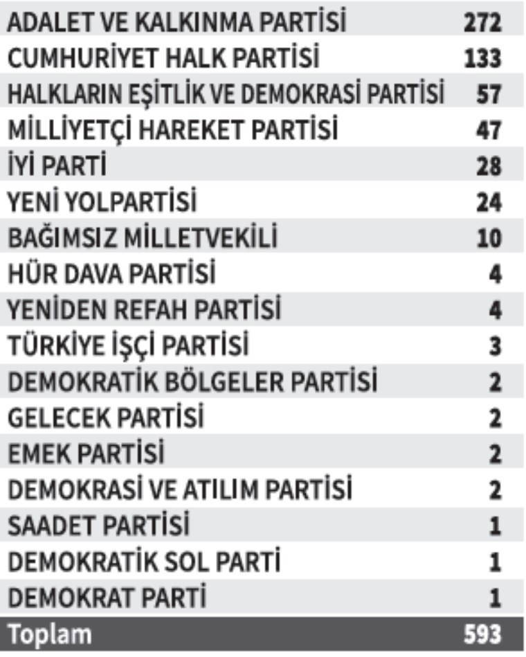 Aşağıda, TBMM’nin resmi sitesindeki sandalye dağılımını alıntıladım ki bu hesabı herkes görebilsin.