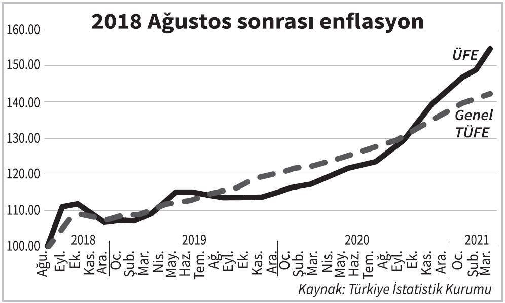 Ancak tüketicileri ilgilendiren mal ve hizmetlerin fiyatlarındaki enflasyon dinamiklerini yönlendiren önemli bir unsur üretim maliyetleri, kısacası üretici fiyat enflasyonu. Bugünün üretim maliyetlerinde gözlenen yüzde 31.40 düzeyindeki sıçrama, yakın gelecekte kaçınılmaz olarak tüketicilerin talep ettiği mal ve hizmetlerin fiyatlarına yansıyacak ve enflasyonist baskıları şiddetlendirecektir.