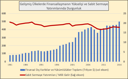 Aşağıda Birleşmiş Milletler Ticaret ve Kalkınma Konferansı Örgütü’nden (UNCTAD) derlediğimiz şekil bu olguyu net biçimde özetlemekte. Şekil, 1980 sonrasında finansal varlıkların küresel düzeydeki şişkinleşmesine karşın, sabit sermaye yatırımlarında ivmelenmenin söz konusu olamadığını belgelemekte.