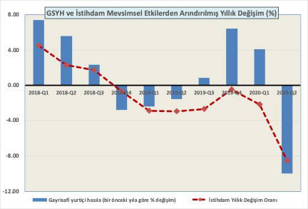 Aşağıdaki şekilde, çeyrek dönemler itibarıyla milli gelir ve istihdamda yıllık değişim oranları sergilenmektedir. İstihdamın seyri üretim sürecinden bağımsız, kendi başına bambaşka gerçeklerle yüz yüze görünümdedir. Bu tespit, Türkiye’nin sergilemekte olduğu milli gelir büyümesinin yapısal özelliklerinin sonucudur.