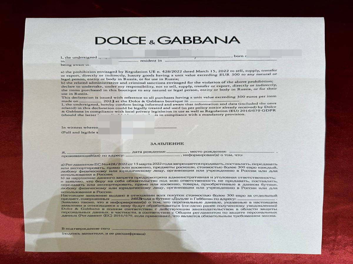 This declaration is issued with reference to all purchases having a unit value exceeding 300 euros per item made on … 2023 at the Dolce & Gabbana boutique in … .