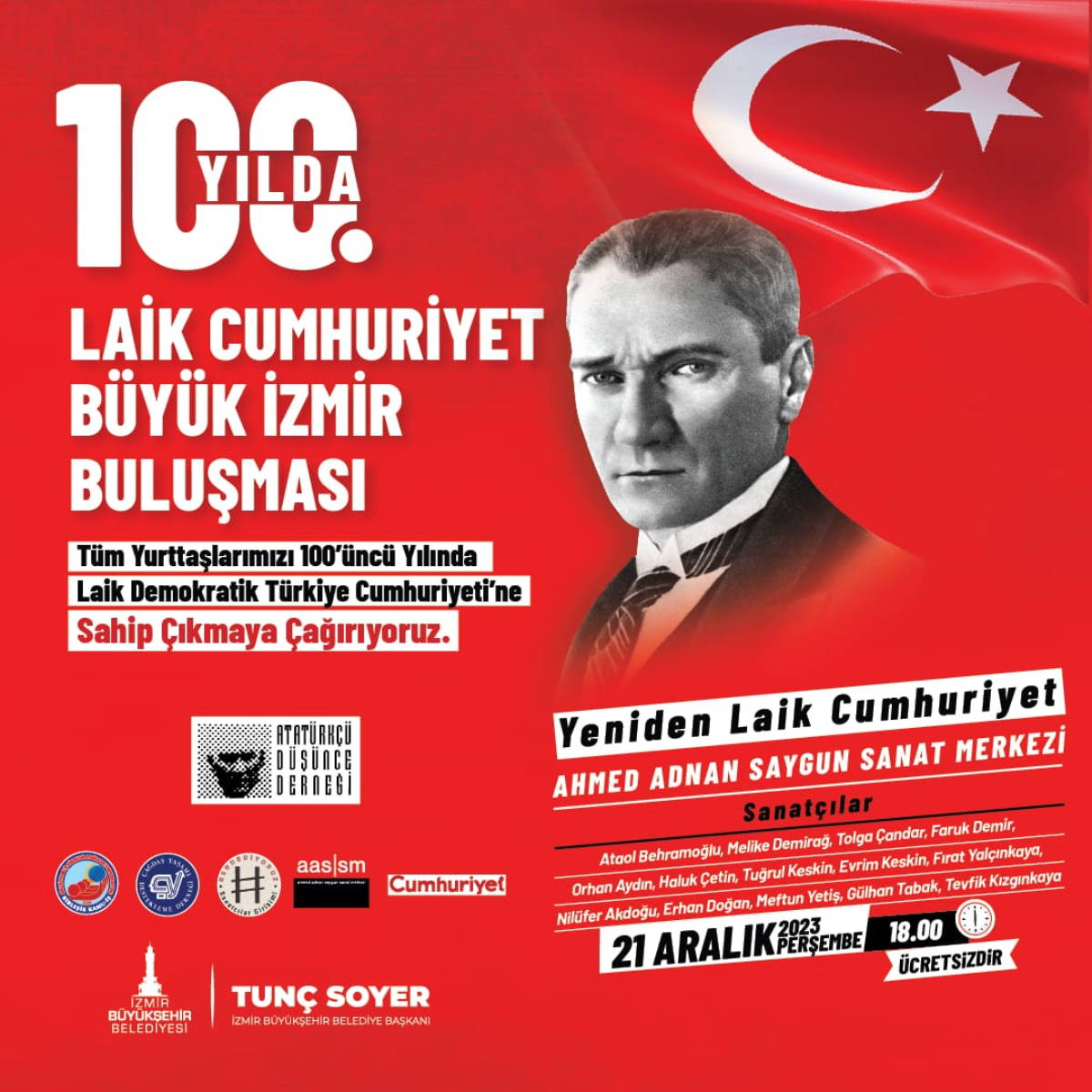 21 Aralık 2023, Perşembe günü saat 18.00’de, Cumhuriyetçilerin İzmir buluşması var. “100. Yılda Laik Cumhuriyet Büyük İzmir Buluşması” adıyla düzenlenen etkinlik, İzmir’de Ahmed Adnan Saygun Sanat Merkezi’nde yapılacak. İBB’nin ev sahipliği yaptığı; ADD, Birleşik Kamu-İş, ÇYDD, Sanatçılar Birliği ve gazetemiz Cumhuriyet’in de düzenleyicileri arasında olduğu büyük buluşmaya, birçok sanatçı şiirleri, türküleri, şarkıları ve seslenişleriyle katkıda bulunacak.