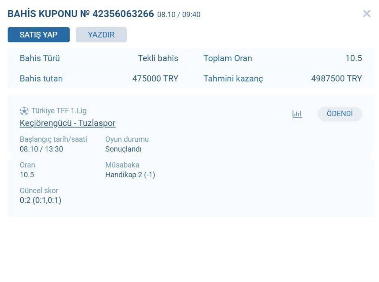 Tesadüf bu ya karşıma Keçiören-Tuzlaspor maçına oynanmış bir bahis düştü. Rus bahis sitesinde bahisi yapan kişi 475 bin TL yatırmış, “Tuzlaspor kazanır” demiş. Bahis sitesinin oranı 1’e 10. Yani Tuzlaspor kazanırsa 1 lira yatırdığınız para karşılığında 10 lira kazanacaksınız. Maçı Tuzlaspor kazandığı için bahis oynayan da 4 milyon 750 bin TL kazanmış. Neden böyle yüksek bir oran verdiğine baktığımda ise meğer bahis oynayan kişi “Tuzlaspor kazanır” dememiş. Tuzlaspor “-1 handikap ile kazanır” ihtimaline oynamış. Yani “Tuzlaspor en az 2-0 kazanır” bahsine girmiş. Büyük iddia oynamış ve kazanmış. Büyük bir parayı riske etmiş. Bilet numarası “42356063266”, oynama saati 08.10/09.40.