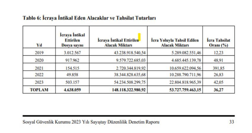 Yapılan incelemede vadesi geçmiş olmasına rağmen tahsil edilemeyen Kurum alacaklarının topluca icraya aktarılması amacıyla kullanılan “otomatik icra uygulamasının” düzenli olarak çalıştırılmadığı, geçmiş yıllarda bazı yıllar yılda bir kere, bazı yıllar ise icraya aktarım işleminin hiç yapılmadığı tespit edilmiş. Kurum alacaklarından icra havuzuna aktarma işlemi 2023 yılında sadece bir kere gerçekleştirilmiş.