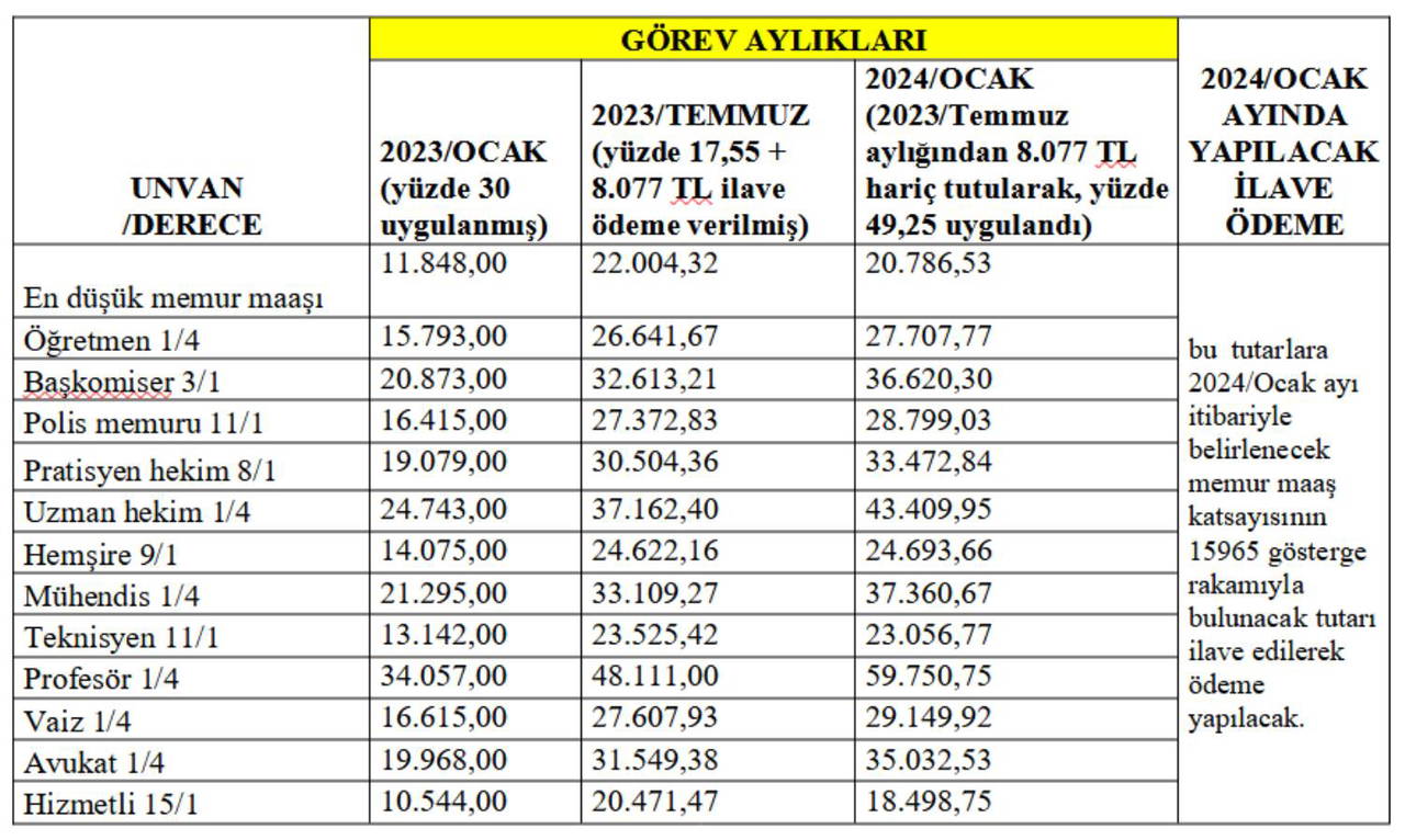2023/Temmuz döneminde çalışan memurlara toplu sözleşme ve enflasyon farkı olarak yüzde 17.55 oranında zam yapıldı ve ayrıca aylıklarla birlikte ödenmek üzere tüm memurlara 15965 gösterge rakamının memur aylık katsayısı ile çarpımı sonucu bulunan 8 bin 77 TL ilave ödeme yapıldı.