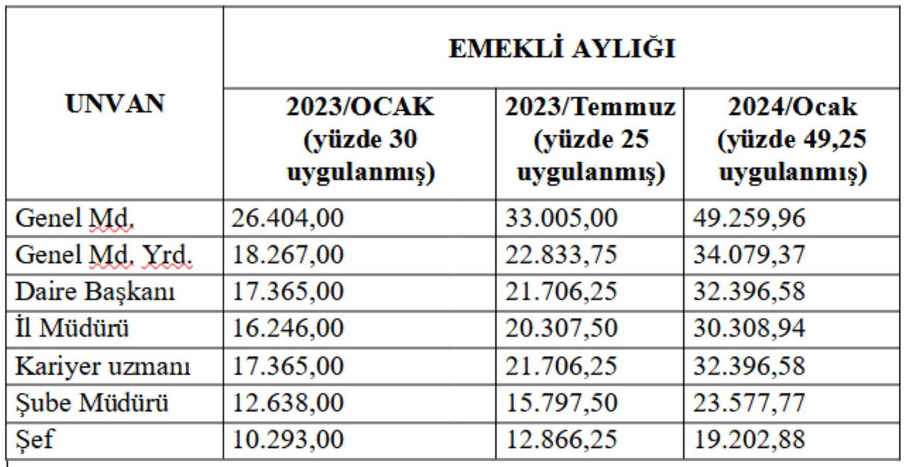 SSK ve Bağ-Kur emekli ve hak sahiplerinin 2023/Temmuz döneminde aylıkları yüzde 25 oranında artırılmış idi. 2023 yılı yıllık enflasyon oranı yüzde 64,77 olarak açıklandığından; 2023 yılı Temmuz-Aralık dönemi altı aylık enflasyon oranı yüzde 37,57 oldu.