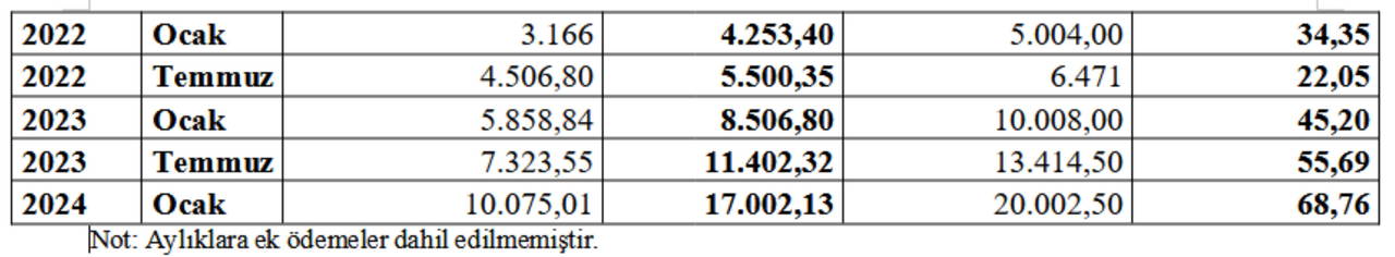 Buna göre; SSK, Bağ-Kur ve Devlet memuru emeklileri ile çalışan memurlar için aylık artış oranları şöyle olacak.