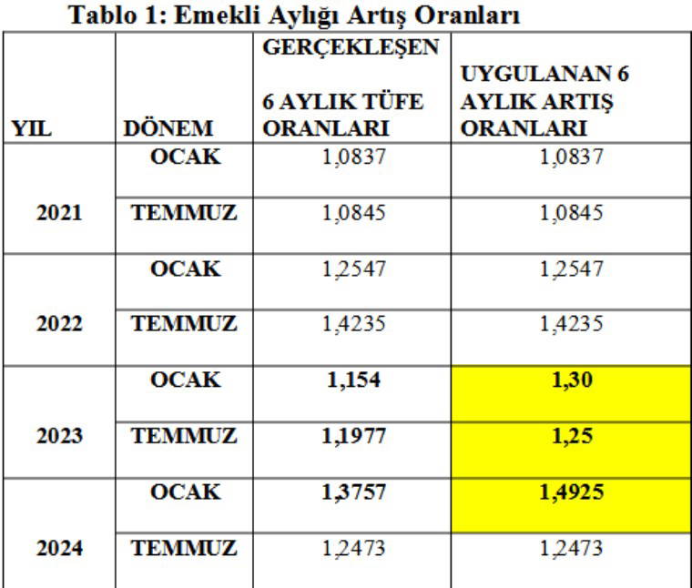 -2024 yılından önce ve 2024 yılında emekli olacakların aylık artışlarında; 2024 yılı Ocak ayında (bir önceki altı ayda 2023 yılı Temmuz-Aralık dönemi) gerçekleşen TÜFE oranı, 2024 yılı Temmuz ayında ise, bir önceki altı ayda (2024 yılı Ocak-Haziran dönemi) gerçekleşen TÜFE oranları kullanılmaktadır. 2024/Ocak ayında belirlenen aylık artışına esas 2023/Temmuz-Aralık dönemi altı aylık TÜFE oranı yüzde 37,57 olduğu halde, üzerine refah payı adı altında verilen ilave ile yüzde 49,25’e yükseltilmiştir. 2024/Temmuz ödeme döneminde aylıklar, 2024/Ocak-Haziran döneminde gerçekleşen altı aylık TÜFE yüzde 24,73 oranında, dolayısıyla 2024 yılında emekli aylıkları kümülatif olarak 1,4925 x 1,2473= 1,8616=) yüzde 86,16 oranında artırılmıştır. Bu oran, 2024 öncesi emekliler ile 2024 yılında emekli olacakların aylıklarına yansıtılmaktadır. Ancak, 2025 yılında emekli olacaklar bu artıştan faydalanamayacaktır.