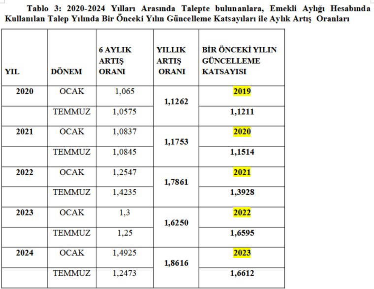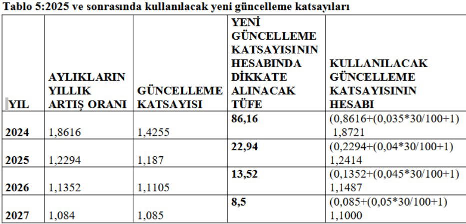 Tablo 4’te gösterilen güncelleme katsayıları, mevcut aylık hesaplama sisteminde hesaplanacak katsayılardır. Ancak, çözüm önerisinde 2025 ve sonrasında hesaplanacak aylıklarda bu güncelleme katsayıları kullanılmayacaktır.