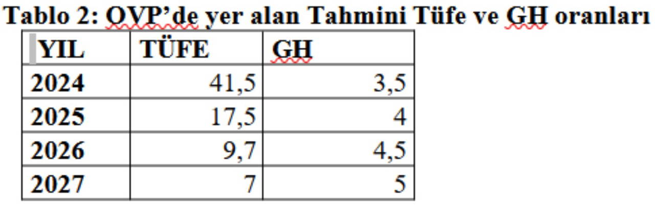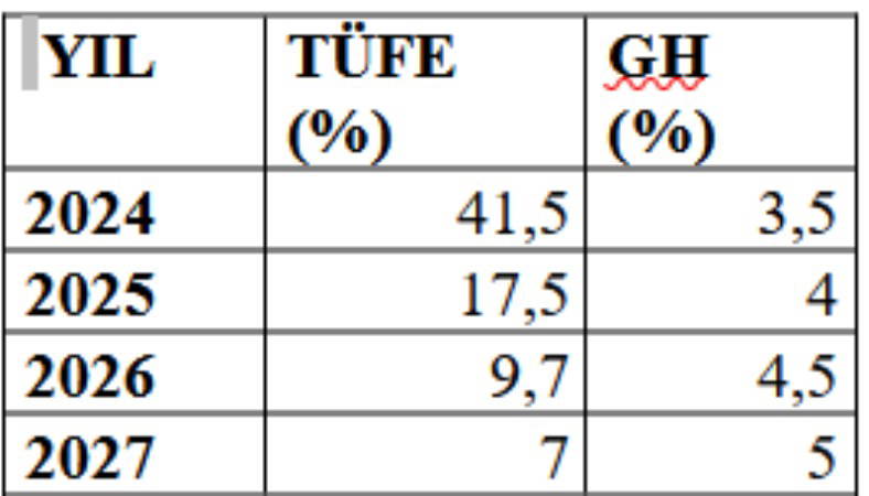Diğer taraftan, Ülkemizin 2025-2027 dönemine ilişkin temel makro ekonomik hedeflerin yer aldığı Orta Vadeli Programda (OVP), 2024 ila 2027 yıllarında tahmin edilen yıllık TÜFE ve GH oranları aşağıdaki tabloda gösterilmiştir.