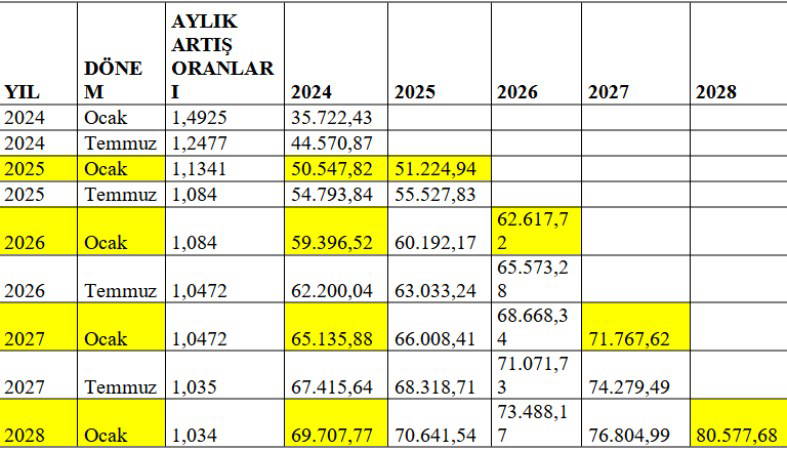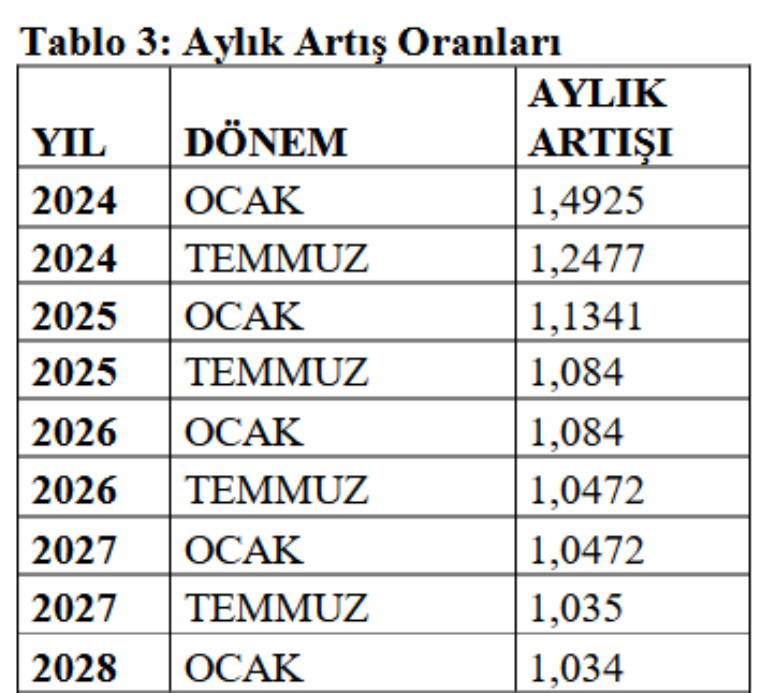 Gerek yıllık TÜFE ve GH oranları gerekse altı aylık artış oranları dikkate alınarak 2025 ve sonrası için oluşturulan yıllık aylık artış oranları ile güncelleme katsayıları aşağıdaki şekilde olacaktır.