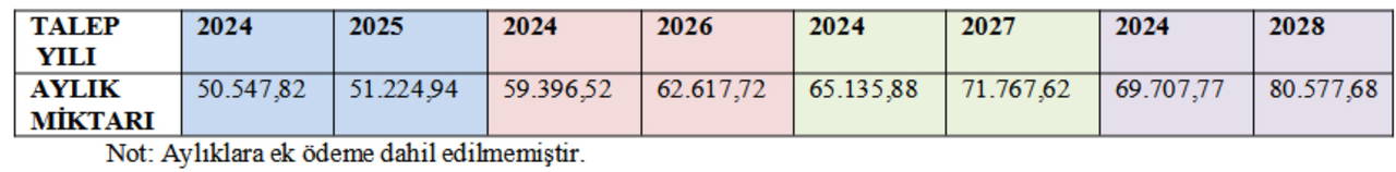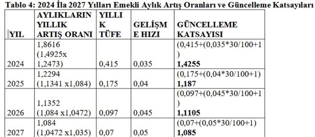 Yine, OVP’de yer alan yıllık TÜFE oranlarına göre 2024 sonrası yıllarda, emekli aylıkları için altı aylık artış oranları aşağıdaki şekilde hesaplanmıştır.