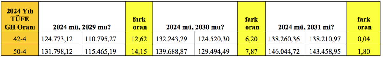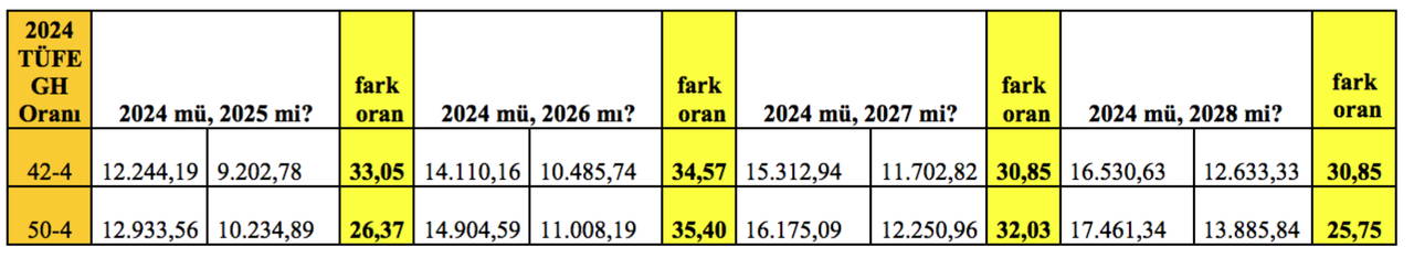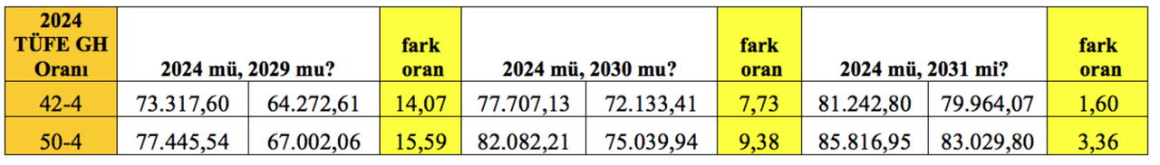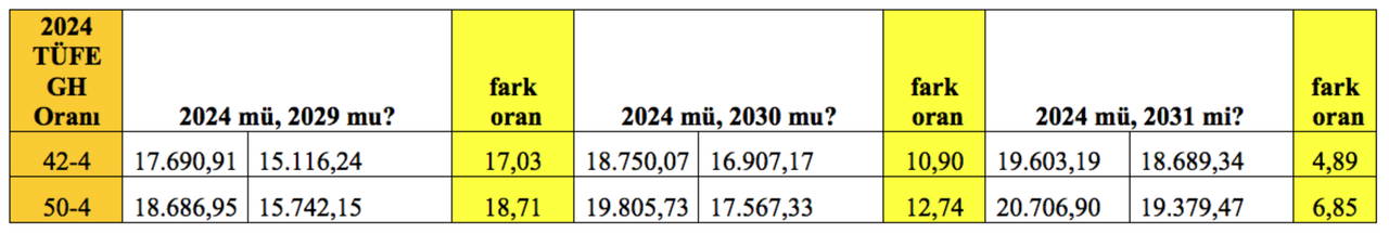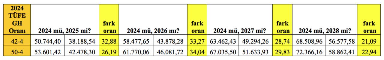 Kamuda çalışan ve prime esas kazançları ortalama ve azami kazançlar üzerinden bildirilen kamu işçisi için ileriye yönelik yapılan aylık hesaplamalarında, 2024 ile 2025 yılı arasında TÜFE oranına göre yüzde 26 ile 32 arasında 2024 lehine oluşan maaş farkları, yine kamu işçisinin 1800 gün yani 5 yıl daha fazla çalışması ve 2030 yılında aylık talebinde bulunması halinde 2024 yılı ile arasındaki maaş farkı yüzde 10’un altına düşerken, farkın ortadan kalkması için en az 6 ve daha fazla yıl çalışması gerekmektedir.