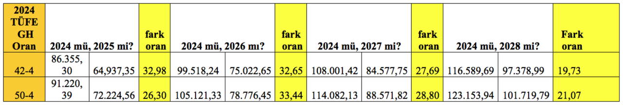 Yapılan aylık hesaplamalarında 2024 yılı için yıllık TÜFE oranı tahmini yüzde 42 ve 50 olarak dikkate alınırken, 2024 yılına ilişkin GH yüzde 4 olarak belirlenmiştir.