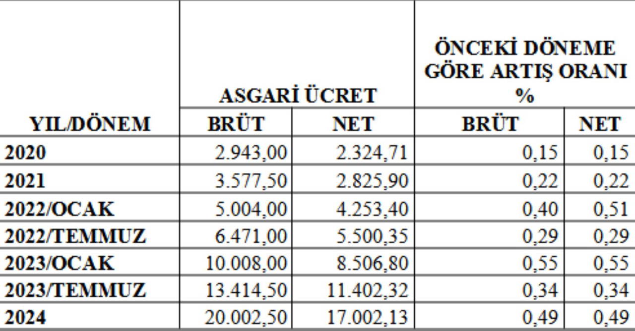 2024 yılında uygulanacak brüt asgari ücret 20 bin 2 lira 50 kuruş, net asgari ücret ise 17 bin 2 lira 13 kuruş oldu.
