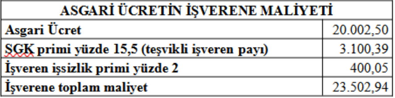 Belirlenen asgari ücretin işverene maliyeti ise şöyle: