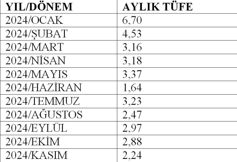 Türkiye İstatistik Kurumu (TÜİK) tarafından 2024 yılı Kasım ayı enflasyon oranının yüzde 2,24 şeklinde açıklanmasıyla birlikte, 2024/Ocak-Kasım dönemi için bir önceki aya göre tüketici fiyat endeksi değişim oranları aşağıdaki tabloda gösterildiği şekilde gerçekleşti.