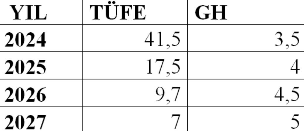 Diğer taraftan, Ülkemizin 2025-2027 dönemine ilişkin temel makro ekonomik hedeflerin yer aldığı Orta Vadeli Programda (OVP), 2024 ila 2027 yıllarında tahmin edilen yıllık TÜFE ve GH oranları aşağıdaki tabloda gösterilmiştir.