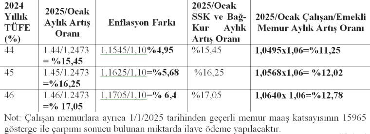 Memur emeklilerinin aylıklarına 2025/Ocak döneminde yapılacak artışlar, 2024 yılı TÜFE oranının;