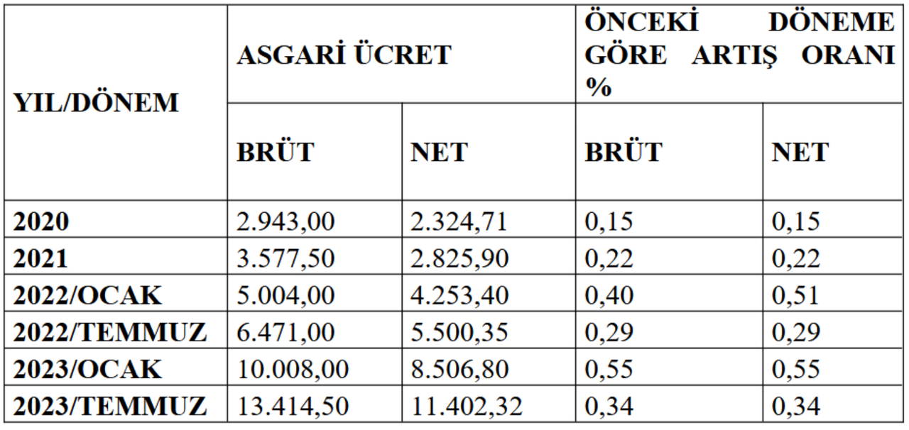 2023/Temmuz ayı itibariyle brüt asgari ücret tutarı olan 13.414,50 TL’nin, OVP’de 2024 yılı tahmini enflasyon oranı olan yüzde 33 oranında artırılması durumunda; brüt asgari ücretin 17.841,29 TL, net asgari ücretin 15.165,10 TL, asgari ücretin yüzde 50 oranında artırılması halinde ise, brüt asgari ücretin 20.121,75 TL, net asgari ücretin ise 17.103 TL olması muhtemel görünüyor.