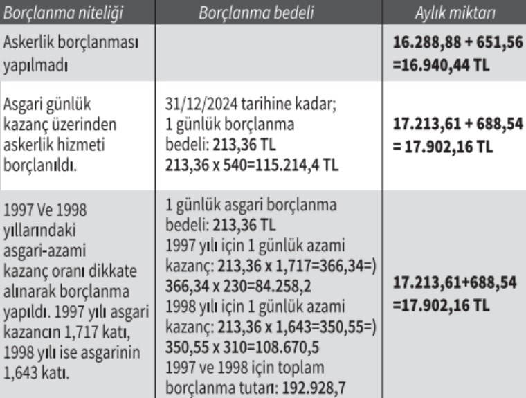 Askerlik borçlanmaları emekli aylığı hesaplamalarında; askerlik hizmetini sizin gibi sigortalılık başlangıcından sonra yapanlar için, askerlik yapılan ilgili yıllara gün ve kazanç olarak mal edilerek hem kazançları hem de aylık bağlama oranlarını etkilemektedir. Sigortalılar borçlanma başvuru tarihinde asgari ile azami kazanç arasında olmak kaydıyla istedikleri miktar üzerinden borçlanma yapabilmektedir. Borçlanma miktarı belirlenirken borçlanmanın kazanç olarak mal edileceği yıllardaki asgari/ azami kazanç oranına dikkat edilmesi gerekmektedir. Kazanç oluşturulacak yıldaki oran, borçlanma talep tarihindeki orandan düşük ise kazanç oluşturulacak yılda geçerli orana göre borçlanma yapılması daha avantajlıdır. Çünkü daha az prim ödeyerek daha yüksek aylık alınabilecektir. Askerlik hizmetinizi yaptığınız 1997’de asgariazami kazançlar arasındaki oran, 1.717, 1998’de ise 1.643’tür. 2024’te asgari-azami arasında oran 7.5’dur. Bugün en yüksek kazanç üzerinden yani günlük asgari kazancın 7.5 katından borçlanma yapsanız bile, borçlanmanız ilgili yıllara hizmet olarak mal edilirken 1997’de asgari kazancın en fazla 1.717 katı, 1998’de ise asgari kazancın 1.643 katı şeklinde kazanç oluşturulacak ve aylık hesabında bu kazançlar dikkate alınacaktır. Onun için bazen asgariden de azamiden de borçlanma yapsanız bile emekli aylığınıza yansıması aynı olabilmektedir. Askerlik hizmetinizin 1997 yılında 230, 1998 yılında 310 gün olması ve 2000 öncesi ve gösterge tespitine giren yıllar olması nedeniyle yapılan aylık hesabında; öncelikle 540 günlük borçlanma, prim ödeme gün sayısına ilave edileceğinden aylık bağlama oranınızı mutlaka artıracaktır. Ancak 2000 öncesi gösterge tespitine giren yıl sayısı ve kazanç tutarları önemli olduğundan, bazen askerlik borçlanması asgari kazancın üstünde yapılsa bile göstergede herhangi bir değişiklik olmamaktadır.