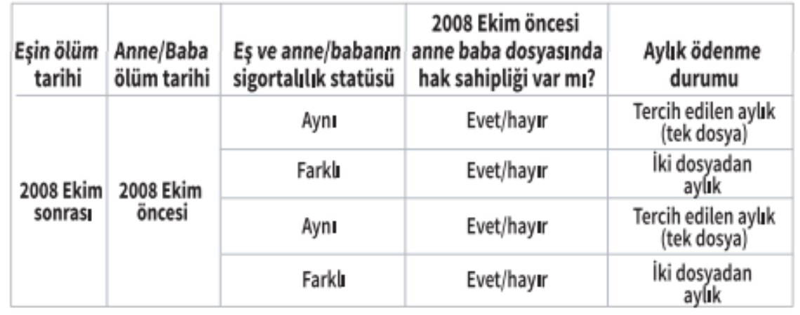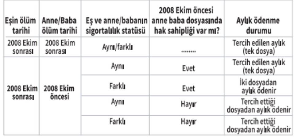 2008/Ekim sonrası vefat eden eşinden dolayı ölüm aylığı almakta iken ölüm tarihi 2008/Ekim ayından önce veya sonra olan babasından/annesinden dolayı farklı ya da aynı statü kapsamında 5/12/2017 tarihinden sonra ölüm aylığı bağlanması talebinde bulunanlara, ana/baba dosyasında 2008/Ekim öncesi hak sahipliği bulunup bulunmadığına (5510 sayılı Kanunun geçici 1. maddesi kapsamına girip girmemesine göre) göre değerlendirme yapılarak, hak sahipliği yoksa kanunun 54. maddesi gereğince tercih ettiği aylık, hak sahipliği var ise ana/ babanın ölüm tarihinde geçerli mevzuata göre aylık bağlanmaktadır.