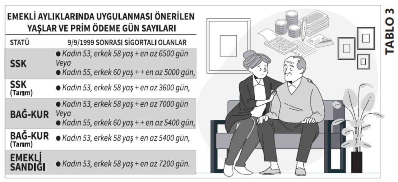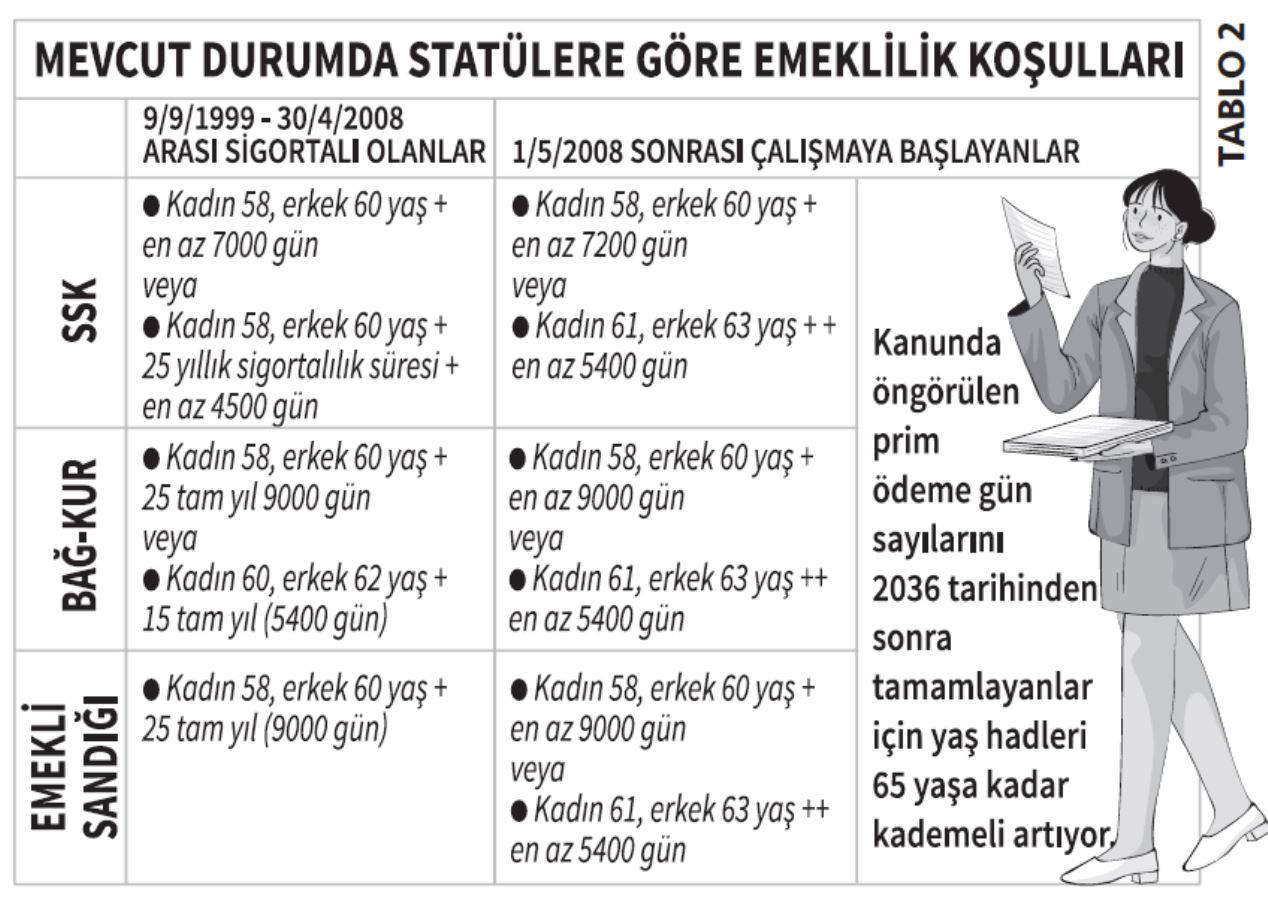9 Eylül 1999 tarihinden sonra çalışmaya başlayanların emeklilik koşulları değiştirilmeli: SSK, Bağ-Kur ve devlet memurları için mevcut durumda 9/9/1999-30/4/2008 ile 1/5/2008- sonrası çalışmaya başlayanlar için emeklilik koşulları aşağıdaki tabloda gösterildi. 8/9/1999 tarihinde yürürlüğe giren 4447 sayılı kanunla 5 temel sosyal güvenlik yasasında (506, 1479, 5434, 2925 ve 2926) yapılan değişiklikle, yaş haddi olmaksızın emekli olma olanağı ortadan kaldırılmış ve kadında 58, erkekte 60 olarak belirlenen emeklilik yaşları 2008/Ekim ayında yürürlüğe giren 5510 sayılı kanunla, kademeli olarak 65’e yükseltilmiştir.
