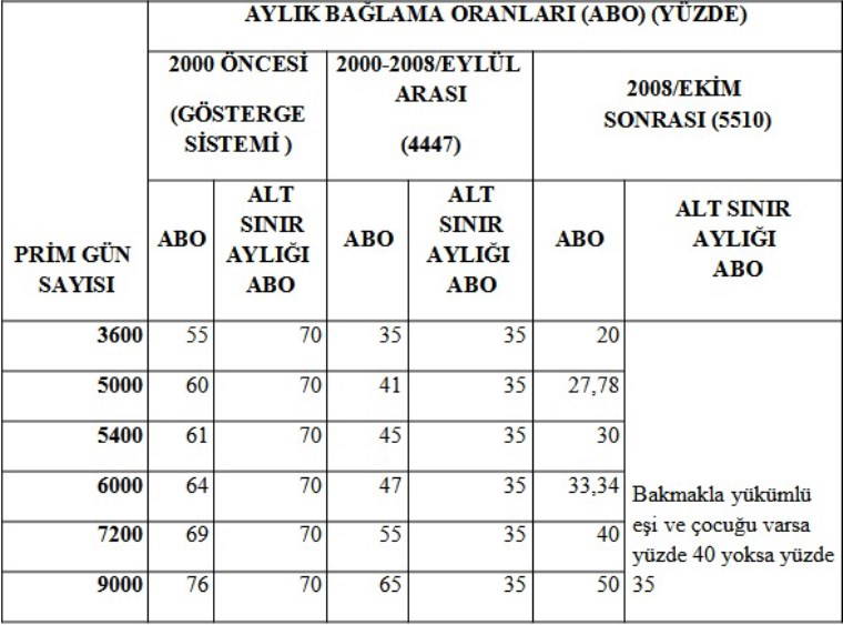 ABO: Toplam prim ödeme gün sayısının her 360 günü için yüzde 2 olarak uygulanıyor. Karma sisteme göre bağlanan aylıklarda, sigortalının 2008/Ekim ayına kadar ki hizmet süresi 3600 günün altında ise, bu hizmet süresini 3600 güne tamamlayan her 360 gün için yüzde 3, diğer kısmı için ise yüzde 2 oranı uygulanıyor. Bu hesaplamada 360 günden eksik süreler orantılı olarak dikkate alınıyor. Yaştan artırım yok. ABO yüzde 90’ı geçemiyor.