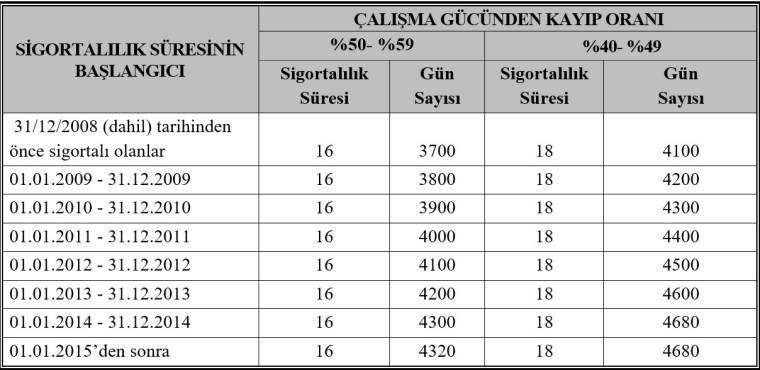 - % 50 ila %59 arasında olduğu anlaşılan sigortalılar, en az 16 yıldan beri sigortalı olmaları ve 4320 gün,