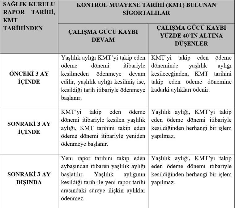 5510 sayılı Kanunun 28.mad/beşinci fıkra kapsamında tarafına yaşlılık aylığı bağlanan ve SGK sağlık kurulunca kontrol muayene tarihi (KMT) belirlenenlere SGK, Sosyal Sigorta İşlemleri Yönetmeliğinin 78. Maddesi gereğince KMT’lerinden en az 3 ay önce yazı ile sevk talebinde bulunarak KMT’lerini yaptırmaları gerektiğini bildirmektedir. Dolayısıyla, KMT’lerini yaptırarak yeni sağlık kurulu raporlarını, KMT’den önceki 3 ay içinde, sonraki 3 ay içinde ve sonraki 3 ay dışında alan ve kurum sağlık kurulunca yapılan değerlendirme sonucu çalışma gücü kaybı devam edenler veya kayıp oranları yüzde 40’ın altına düşenlerle ilgili olarak aylıkların devamı ve kesilme durumu aşağıdaki tabloda gösterilmiştir.