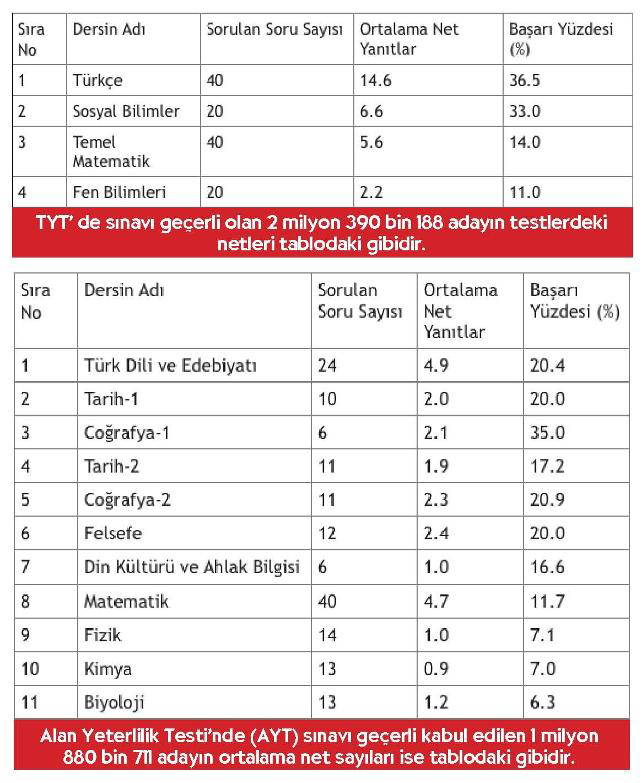 Alan Yeterlilik Testinde (AYT) sınavı geçerli kabul edilen 1 milyon 880 bin 711 adayın ortalama net sayıları ise tablodaki gibidir. Bu testlerde en başarısız alanlar fizik ve kimya oldu. Adaylar her iki alanda da soruların sadece yüzde yedisini doğru işaretlemiş. Tabloda görüldüğü gibi testlerin hiçbirinde yüzde ellilik başarı yakalanmamış. Sonuçlar gösteriyor ki YKS sınavı bir lise bitirme sınavı olsaydı öğrencilerin büyük bir çoğunluğu liseyi bitiremeyecekti. Okullarımızın sadece yüzde 2.5’i amacına ulaşmış oluyor. Yüzde 25.8 civarındaki öğrenci de ortalama civarı bir başarı gösteriyor. Bu da okullarımızın yüzde 75’inin bir lise ve meslek lisesinden beklenen beceri ve başarıyı sağlayamadığını ortaya koymaktadır. Okullarımızın yüzde 98’i de ideal düzeyde değil. Sistemin aynası olan bu sınav sonuçlarının üniversitedeki eğitimin niteliğini de etkileyeceği çok açık. MEB ve YÖK sınav sonuçları ile mutlaka yüzleşerek eğitimin nitelik kaybını önleyecek adımlar atmalıdır.