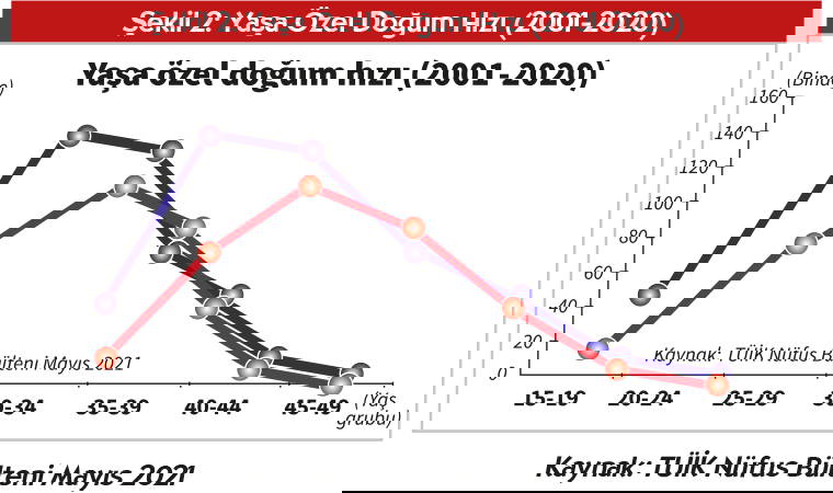 Kuramsal olan TDH, bir kadının 15-49 yaşları arasında doğurabileceği ortalama çocuk sayısını gösterir. Buna göre 2001 yılında kadın başına 2.38 olan TDH, 2020 yılında 1.76’ya düşüyor. Türkiye nüfusunun gerçekleştirdiği dönüşüm, AB ülkelerinin doğurganlığına (AB: TDH=1.53) yaklaşıyor. Bir başka anlamlı değişim doğum yapan annelerin ortalama yaşlarının yükselmesi şeklinde oluyor.