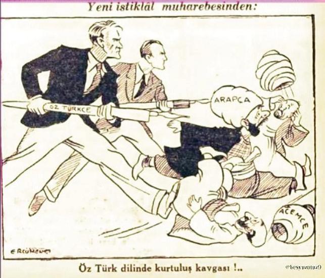 Atatürk elinde “öz Türkçe” kalem ile Arapça ve Farsça kelimelerle mücadele ediyor. (Cumhuriyet, 29 Eylül 1932) (Görsel1)